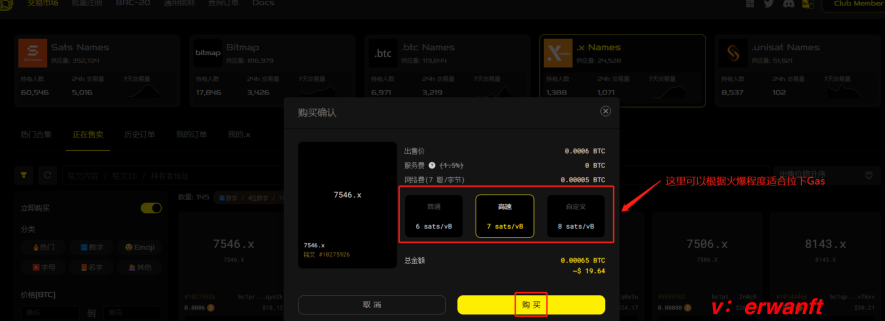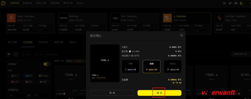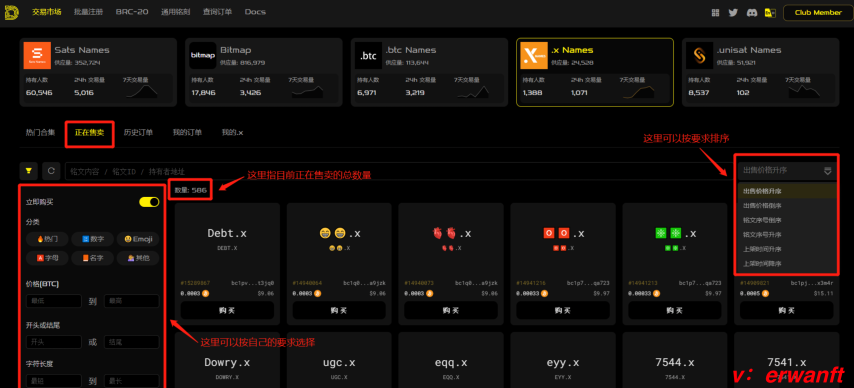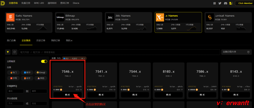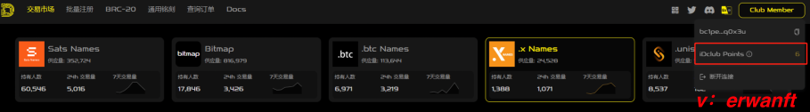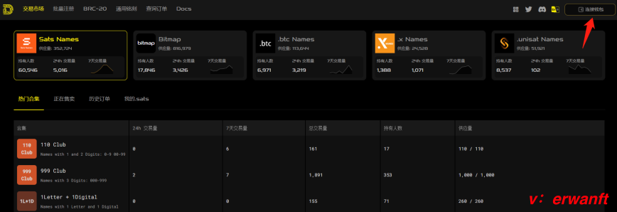点击右上角连接钱包,连接之后,目前在交易市场这里,可以看到,有5种不同的后缀域名的,分别是.sats 、.bitmap、.btc、.x 和.unisat