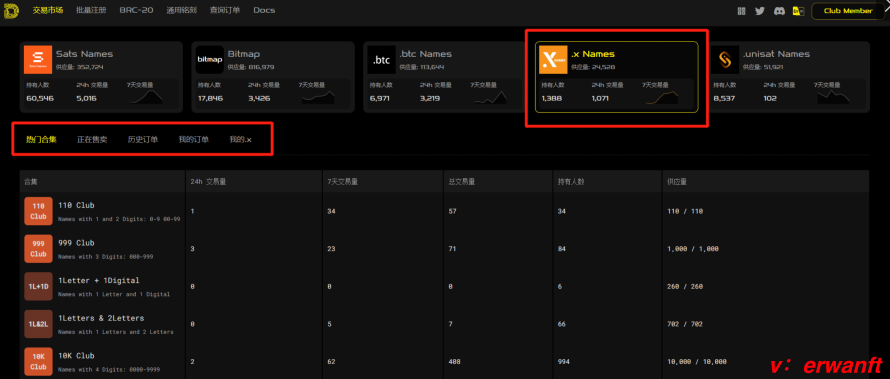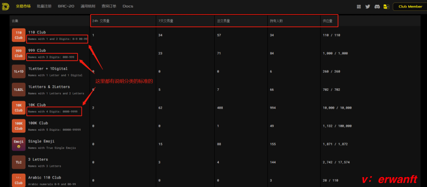 热门合集下面有做好了分类,比如第一个 110 club:指1~2位数的,999 club:指3位数的,每一个分类下面都有说明的,同时,还能看图上看出每个分类的24h交易量、7天交易量、总交易量、持有人数和供应量,如下图:
