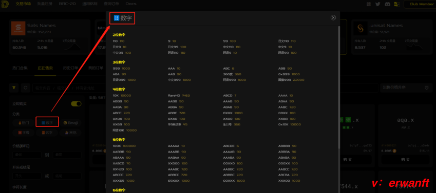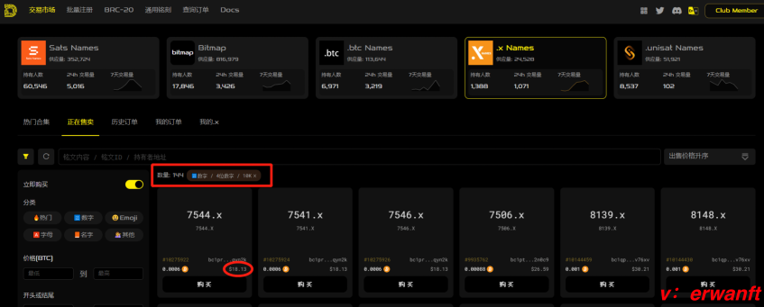 同样的道理,正在售卖中,可以在左侧点数字,找出4位纯数字的域名,看到目前地板价7546.x,地板价18.13U。