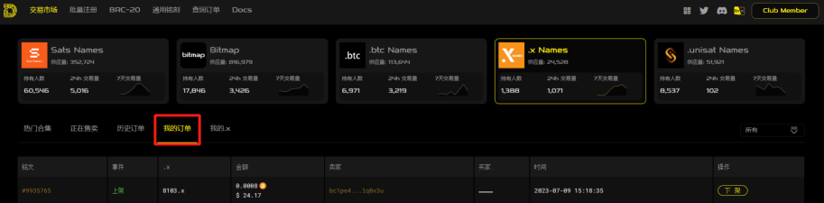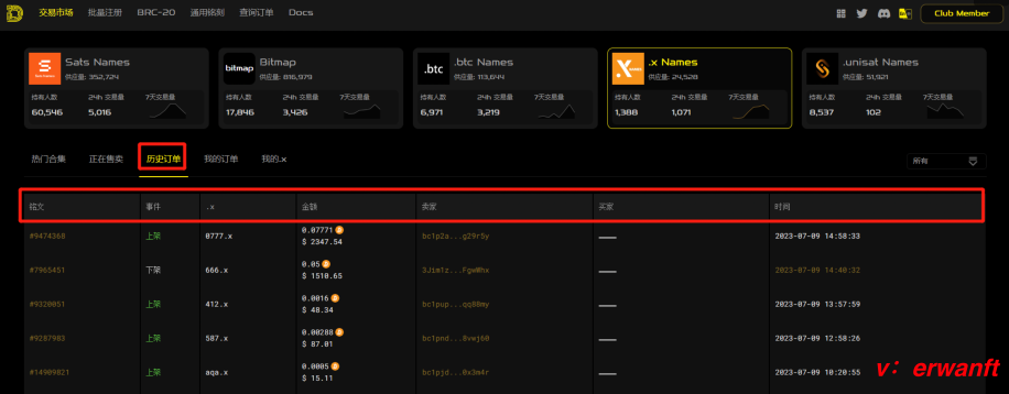 历史订单这列,可以看出对应铭文(域名)的编号,上下架情况,上下架金额,买家和卖家,以及时间