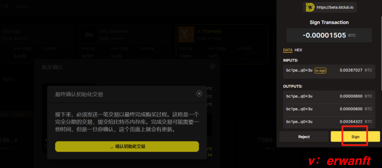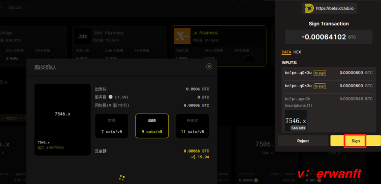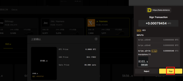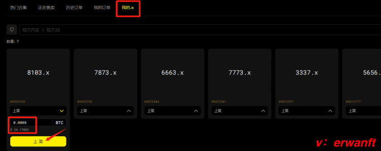 因数前3个都是18.13U,都是含有4字结尾的,第4位26.59U(也就是0.00088BTC),那8103.X就挂0.0008BTC。点击上架--sign即可