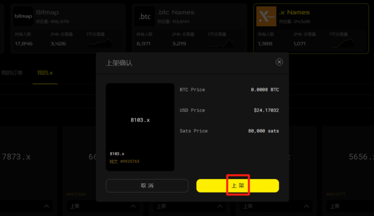 我的.X这列,当链接钱包之后,这里就显示出钱包里的对应域名数量,在这里就可以看到有“上架”的入口