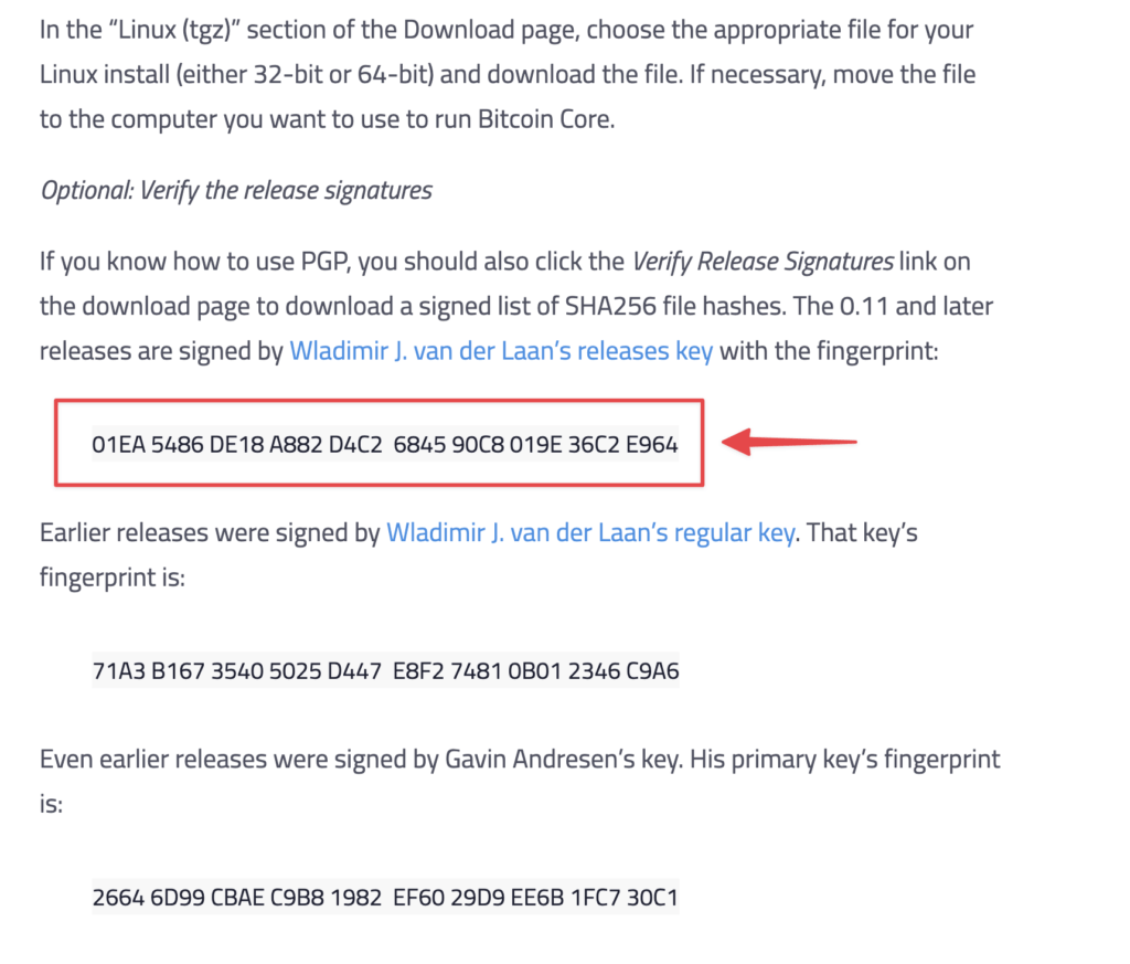 访问 Bitcoin Core 网页,你可以清楚地看到,Bitcoin Core 0.11 及以后的版本的安装包都是由 Wladimir J. van der Laan 的发布密钥签名的。下面的教程我会以 macOS 为例,其他系统的设置基本通用。