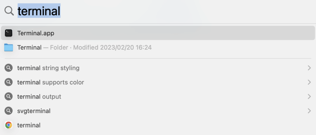 ●macOS 用户,敲击 CTRL + 空格键,唤出 Spotlight,输入 terminal,打开终端。