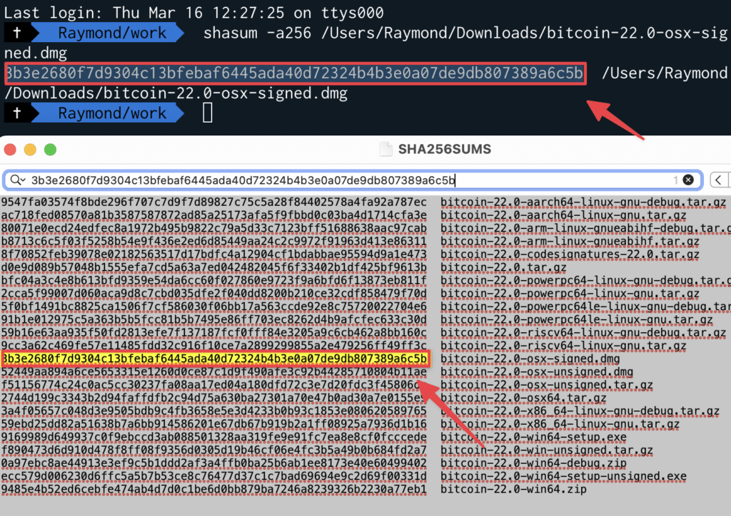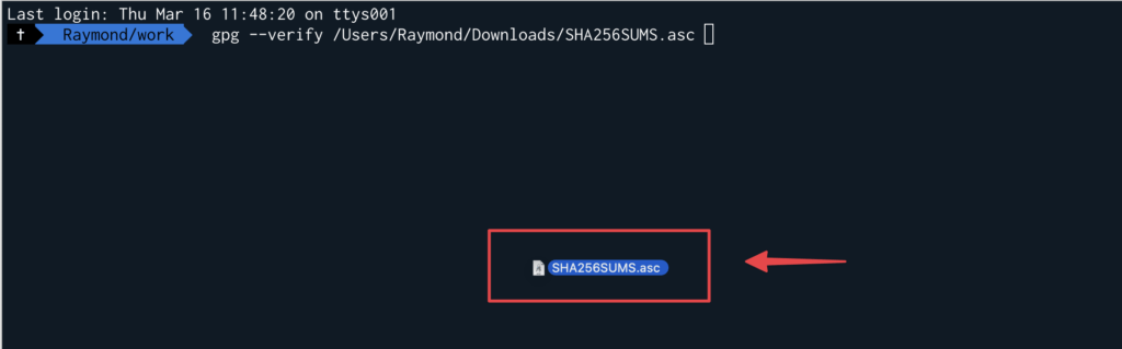 你可以直接把安装包丢入终端,它会自动补全路径。敲击回车,这时候你可以看到出现一串字符,将这串字符与 SHA256SUMS 文件内容比对,你会发现版本、签名信息一致。