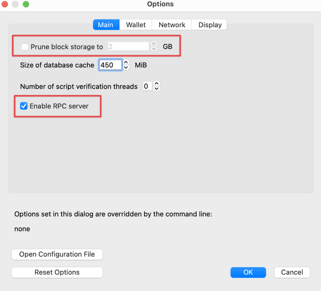 ●去掉 Prune block 选项(我们需要同步所有比特币网络的区块,修建区块则达不到这个目的)