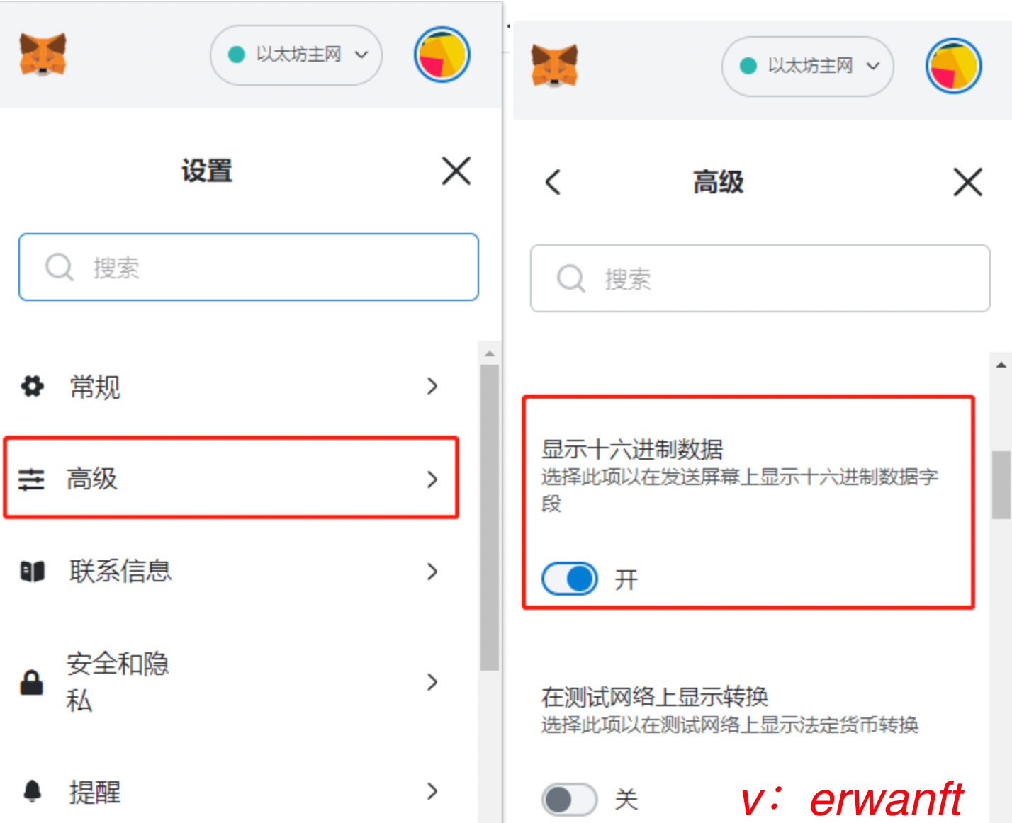 之后打开小狐狸钱包,选择以太坊主网,设置---高级--把十六进制数据打开,如下图: