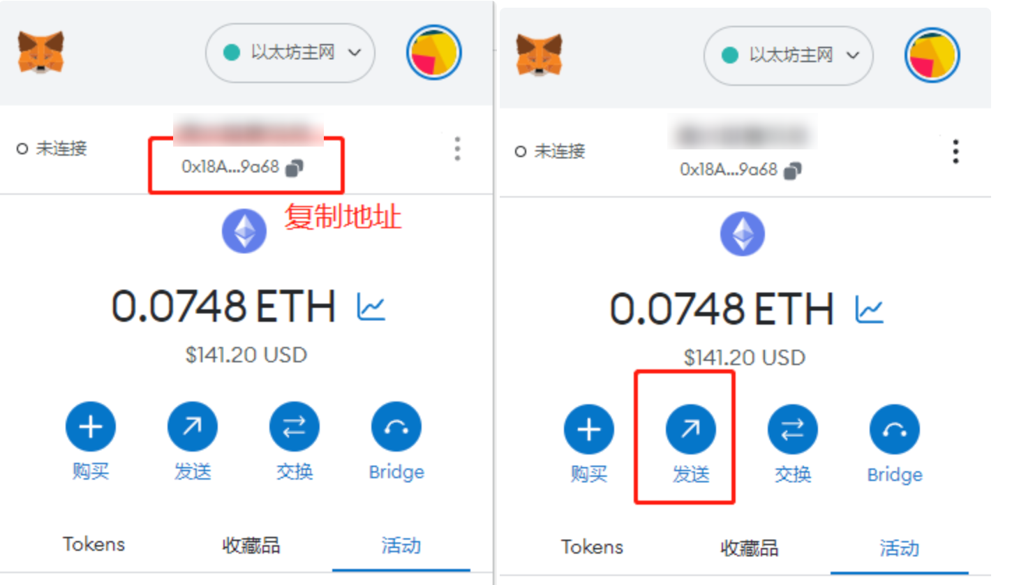复制自己的以太链的钱包地址,点发送