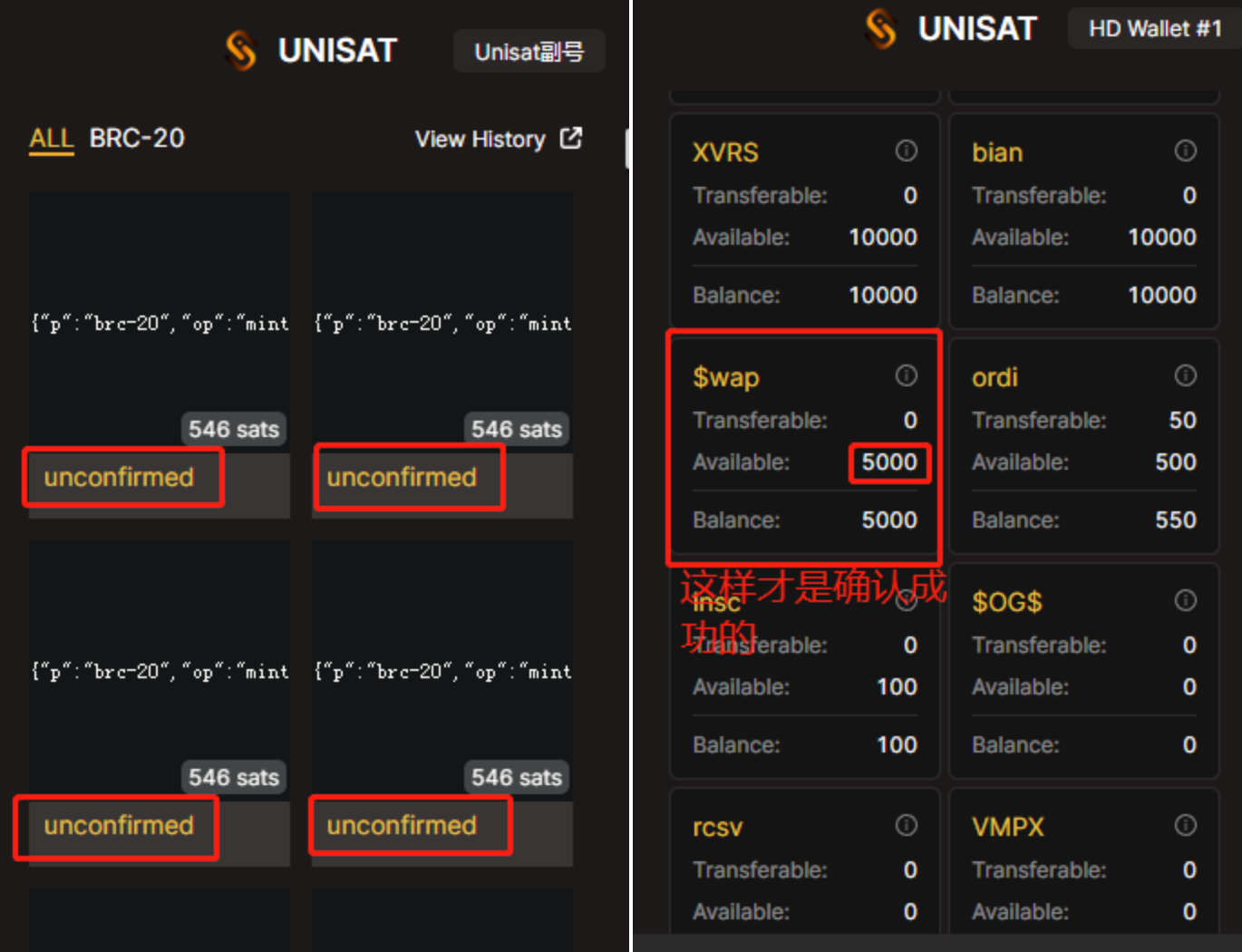 提交之后,在我的钱包里面看到是下图右边这种纯白色字体的代表打成功了,左边这种代表还未确认。